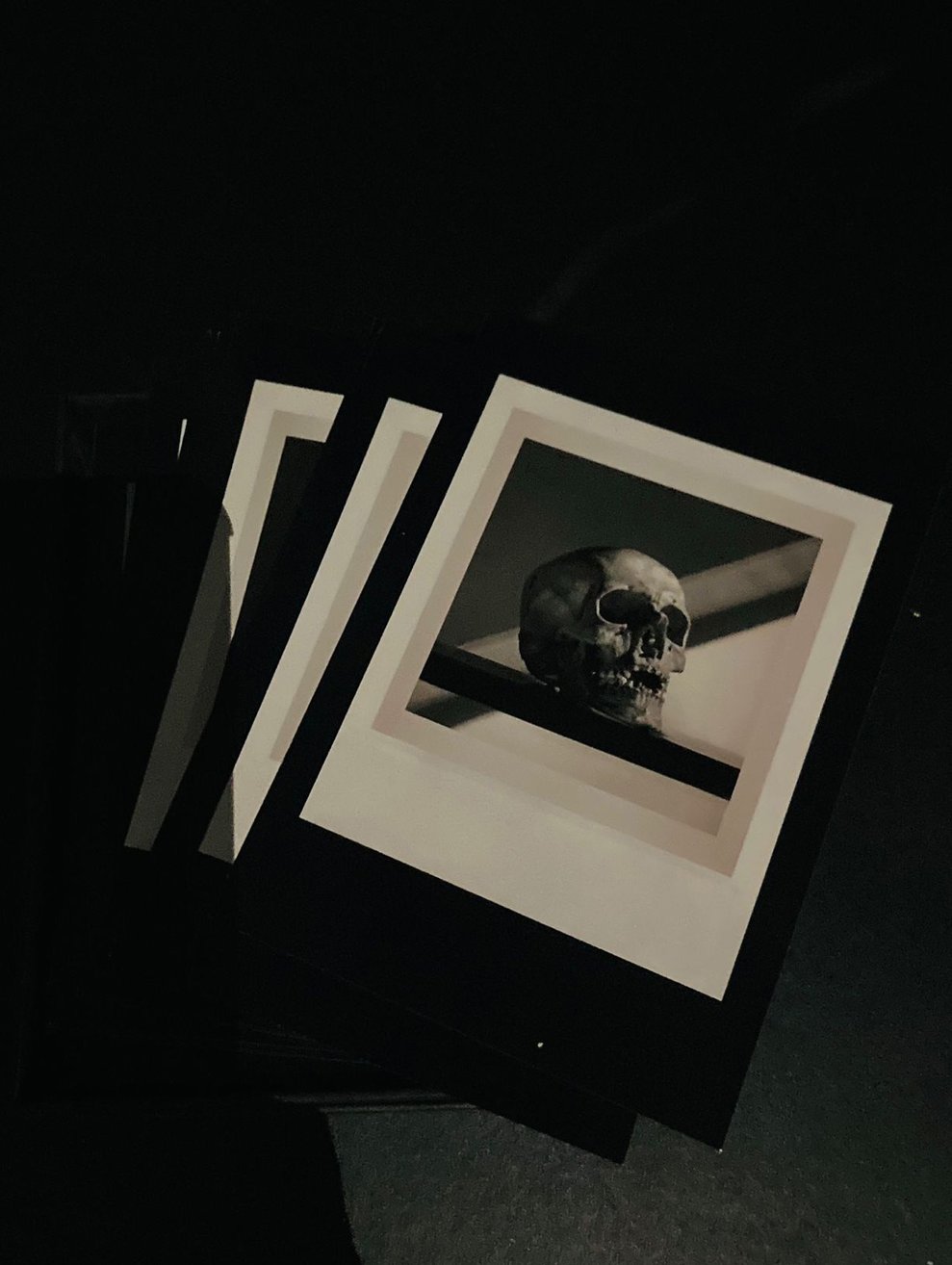 Bei diesem Fundstück gab es trotzdem einen Schreck, als die Schreibenden dieser Worte ganz unverhofft im Halbdunkel des Archivs einem Schädel gewahr wurden. Zugegeben: Sehr groß war der Schreck nicht, aber deftig genug, um auf das schöne Fundstück aufmerksam zu werden. Bei diesem handelt es sich um „Douglas Gordon's The Vanity of Allegory", ein Ausstellungskatalog in Form einer (deckellosen?) Box, herausgegeben anlässlich einer gleichnamigen Ausstellung im Jahr 2005. Die Box ist gefüllt mit 49 postkartenähnlichen losen Blättern, die Werke, Texte und Bezüge zur oder aus der Ausstellung zeigen. Das Ganze hat etwas von einem kultistischen Bau- oder Setzkasten und verleitet zu einem spielerischen Umgang mit den teils morbiden Motiven. Leider scheint der Katalog nicht vollständig, aber vielleicht geben die Magazin-Geister die fehlenden Teile irgendwann wieder frei – meistens tun sie das.