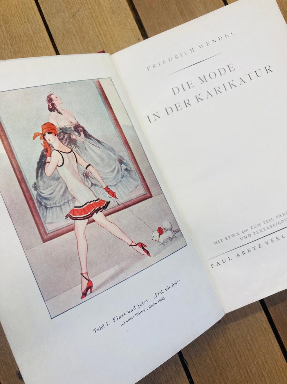 Als drittes gerade eingeschlichenes Fundstück fielen uns noch die „Modeblätter Alfred-Marie“ in die Hände. Zugegeben, das wirkt jetzt etwas nachgeschoben, aber diese Mappe mit handkolorierten Holzschnittdrucken aus den 10er Jahren des 20. Jahrhunderts hatte es uns sofort angetan und wir sahen nicht ein, dass sie hinter den anderen beiden Fundstücken zurückstehen sollte, wenn, dann eher andersherum. Das fragile Mäppchen ist nämlich ein echter Hingucker und wartet neben sehr eigenen Illustrationen auch noch mit seidenem Vorsatz- und selbstgeschöpftem Druckpapier auf, leider hat es vermutlich schonmal bessere Tage gesehen.