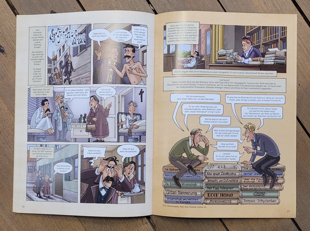 Es ist Jahresendstimmung – manche nennen das weihnachtlich – und passend zu dieser Zeit beschäftigt sich das Fundstück des Monats auch mit einem verrückten Kerl mit einem besonderen Bart: Friedrich Nietzsche. Im Comic „Friedrich Nietzsche – Der revolutionäre Denker“ wird kurz und knapp das Leben des Philosophen abgeklappert und er selber zu einer Art kleinem Superheld (inklusive rotem Cape auf dem Cover) stilisiert. Nietzsches Leben und Werk auf 28 farbig bebilderten Seiten runter zu brechen, ist zwar ein unlösbares Unterfangen, dass auch hier nur bedingt entknotet wird, doch ist das Ganze wohl auch eher als Scherz zu verstehen – welchen der Klappentext auch selbst schon hinterfragt.