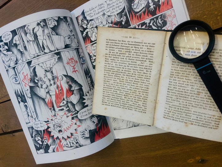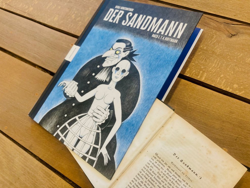Die Zeiten sind gruselig und so ist es auch unser diesmaliges Fundstück, das eigentlich zwei sind und doch irgendwie nicht. Denn es handelt sich sowohl um ein Buch älteren Datums, das gesammelte, noch in Fraktur geschriebene Geschichten enthält, als auch einen Comic zu der im Buch enthaltenen Geschichte „Der Sandmann“. E. T. A. Hofmann, der Autor der Geschichte, gilt als sowas wie der Edgar Allan Poe aus Deutschland, war bei seinen deutschen Dichter- und Autorenkollegen aber durchaus verschrien, während Honoré de Balzac und Charles Baudelaire in Frankreich ihn durchaus abfeierten.
