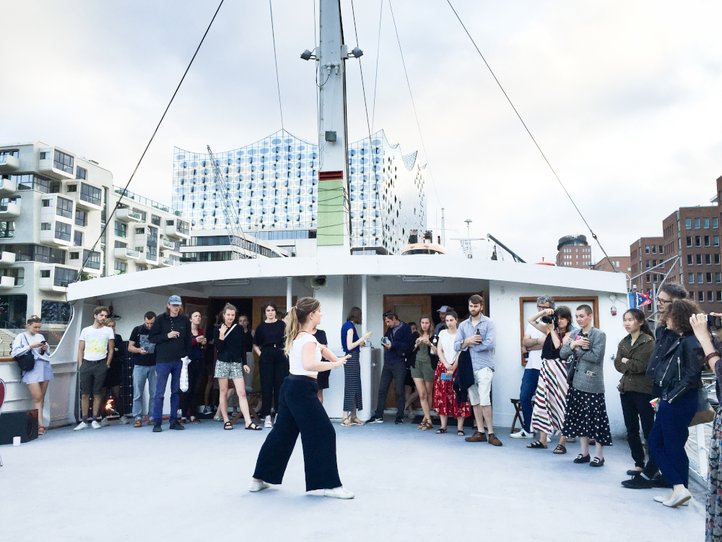 Raphael Sbrzesny, Professor für Kreation und Interpretation mit den Schwerpunkten Sound, Performance und Konzept an der Hochschule für Künste Bremen (HfK Bremen), war am 26. Juni 2019 mit Studierenden beider Fachbereiche in Hamburg zu Gast. Während eines Seminars der Studienstiftung des deutschen Volkes zum Thema „Schnittstellen in Kunst und Musik“, zu dem Sbrzesny als Dozent eingeladen war, entwickelten zehn Studierende aus Integriertem Design, Musik und Freier Kunst ortsspezifische Performances, Interventionen und Werke, welche prominent auf einem Schiff in der Hafencity zu sehen waren. Weitere Dozentinnen waren Ellen Blumenstein, Kuratorin von Imagine the City (Kunst und Kultur in der Hafencity Hamburg), und Prof. Michaela Melián, Professorin für Mixed Media / Akustik, Hfbk Hamburg.
