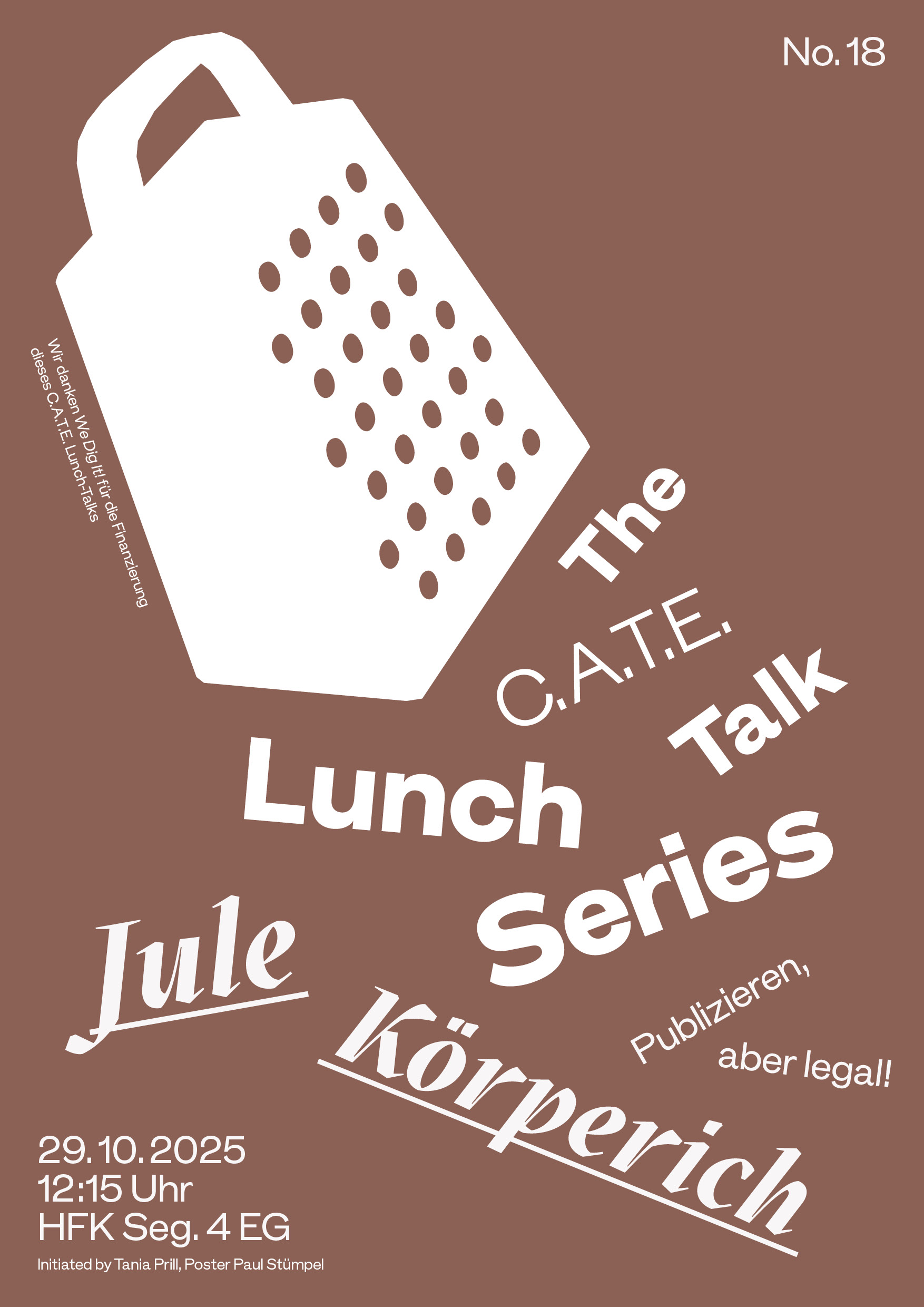 Jule Körperich is an artist (who studied at the HfK) and a lawyer in Bremen specializing in copyright and media law. This lunchtime talk will address specific issues relating to the publication of works.