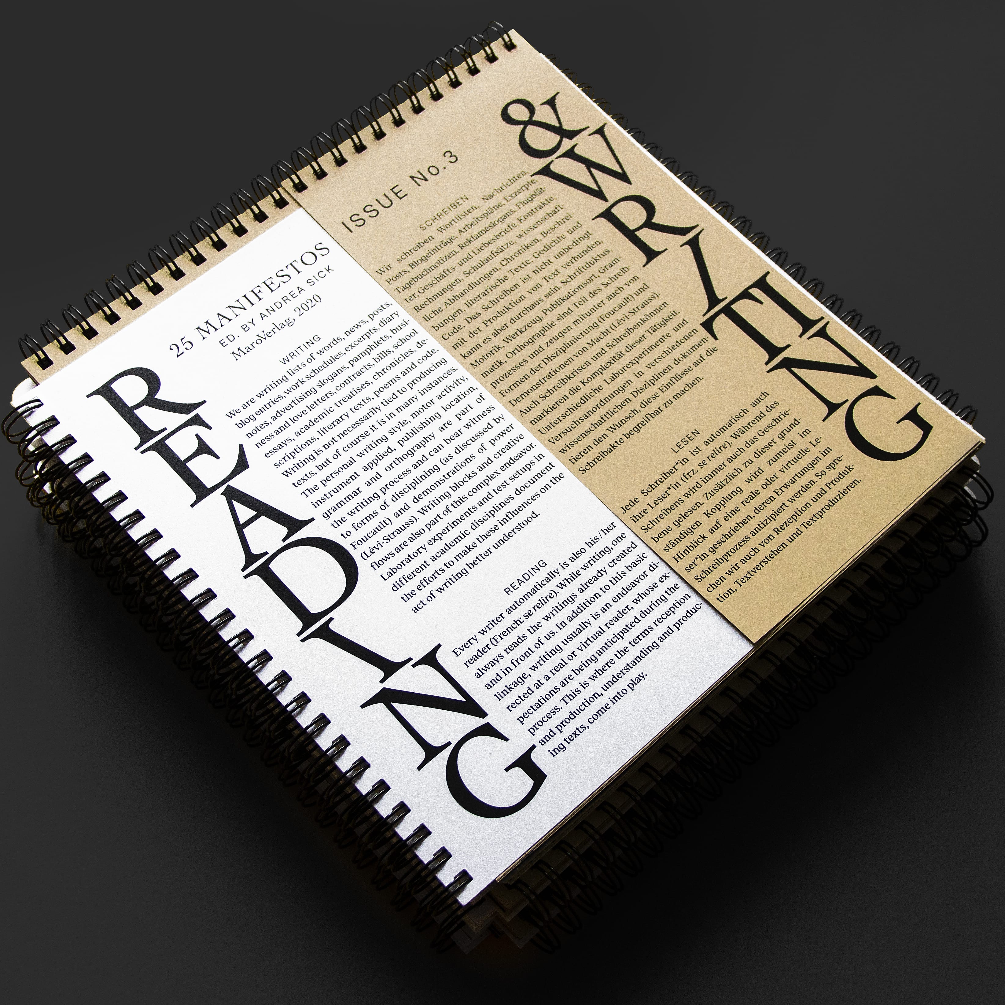 Die Publikation »Reading & Writing. 25 Manifestos« ist die 3. Manifesto-Publikation, die im Rahmen dieses Projektes entsteht. Sie versammelt 25 Manifeste, einige auf Deutsch, einige auf Englisch von 25 Autor*innen: Statements, kühne Behauptungen und Zuspitzungen, die das Feld des »Schreibens & Lesens« bespielen und losgelöst von bereits existierenden Systemen auch Unbekanntes und Illusorisches im Schreiben realisieren.